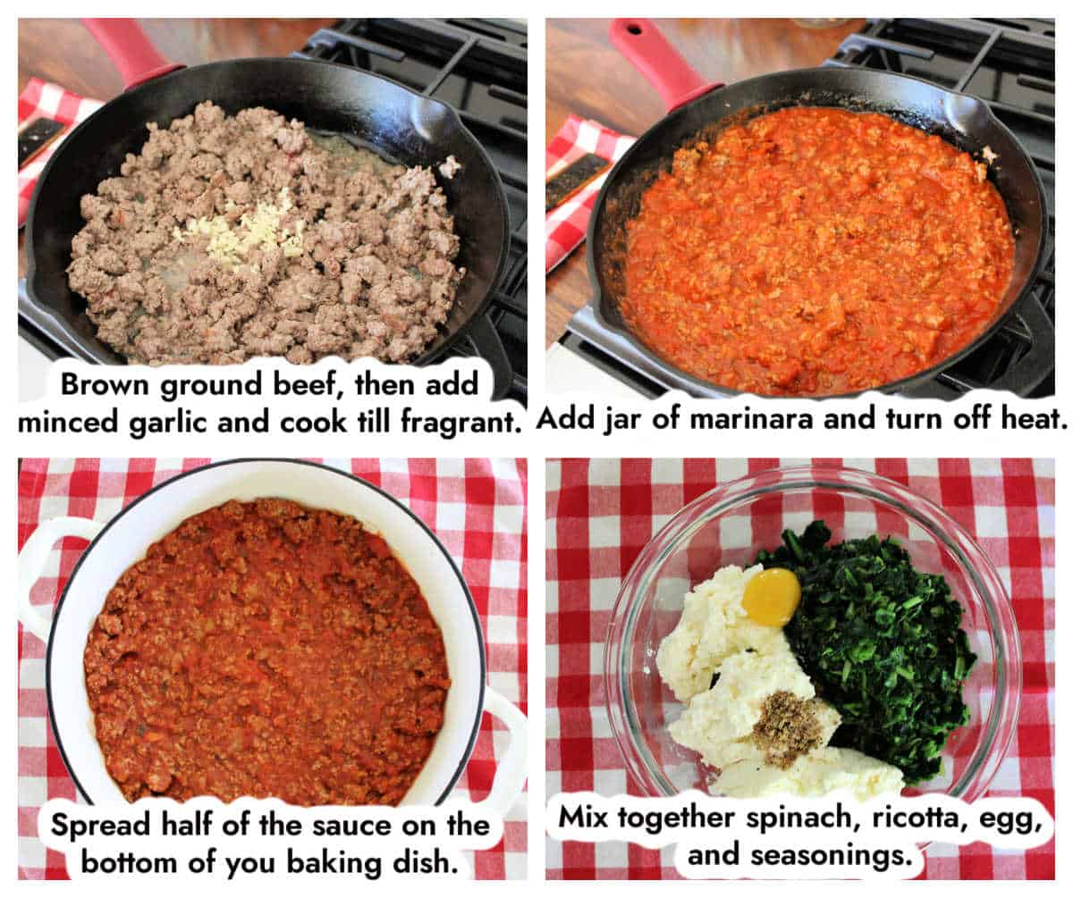 • Spoon half of the ground beef marinara to the bottom of a large baking dish, spreading it in an even layer.